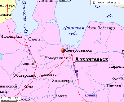 | Северодвинск. Ближайшие города. Расстояния в км. по карте (в скобках по автодорогам) + направление. | |||