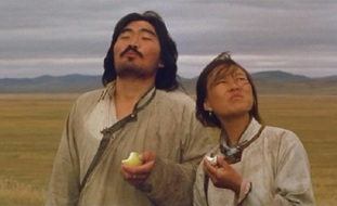 «Урга - территория любви», 1991 год - Молодая монгольская пара, живущая в степи Внутренней Монголии на севере КНР, по законам не может иметь больше трёх детей. Но трое у них уже есть. Тогда Пагма посылает мужа в город за презервативами. Он едет в город вместе с русским шофёром (Владимир Гостюхин). Вместо презервативов Гомбо покупает телевизор, кепку, велосипед и, вернувшись домой, втыкает в землю укрюк (монг. уурга) — шест с петлёй на конце, используемый для отлова лошадей из табуна, который в таком положении традиционно сигнализирует, что в данном месте пара занимается любовью. |